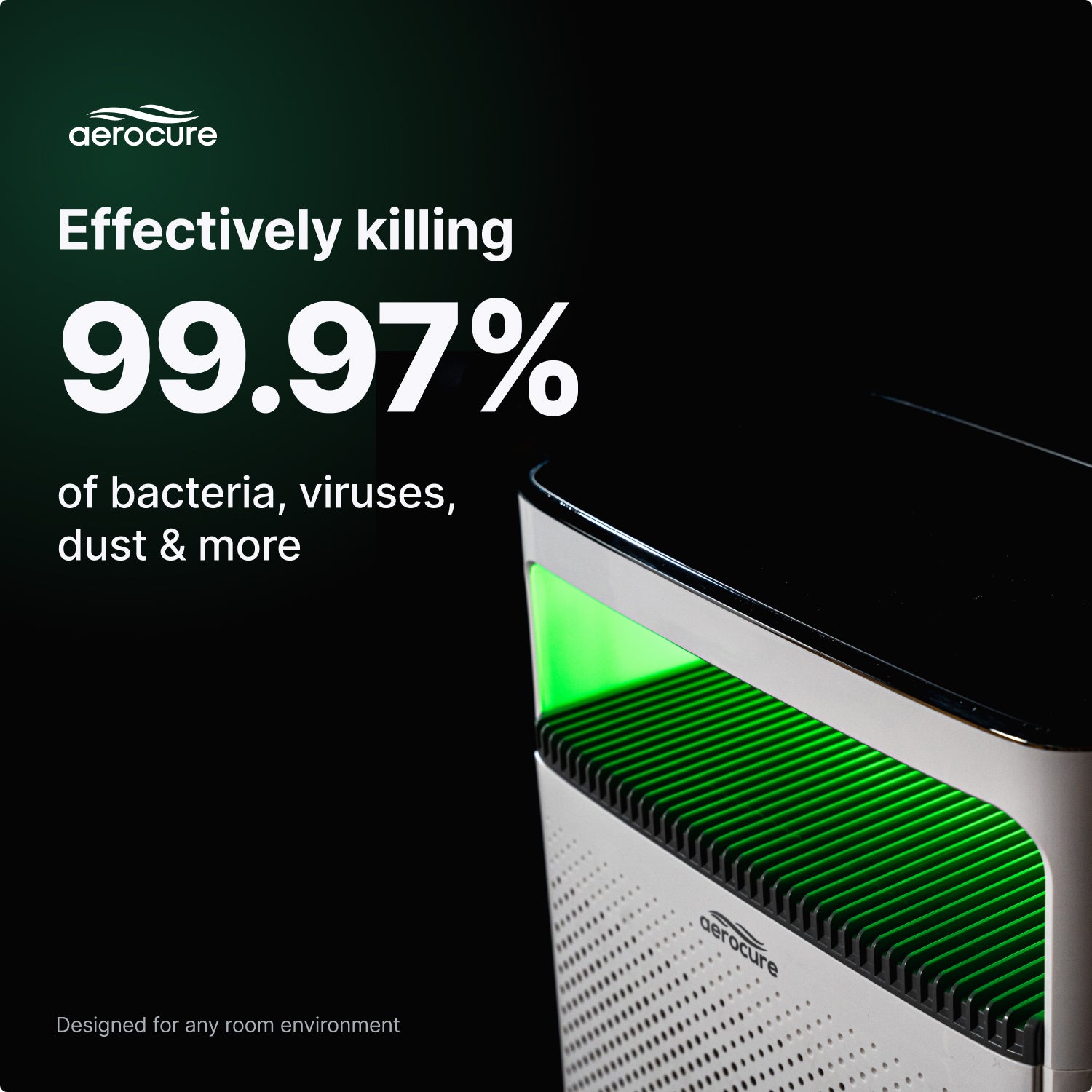 Aerocure's objective is to create a safe living environment, the air purifier/sterilizer kills and filters the air by using UVC light, a negative ionizer and an 8-stage filter which includes a HEPA H11 filter.
